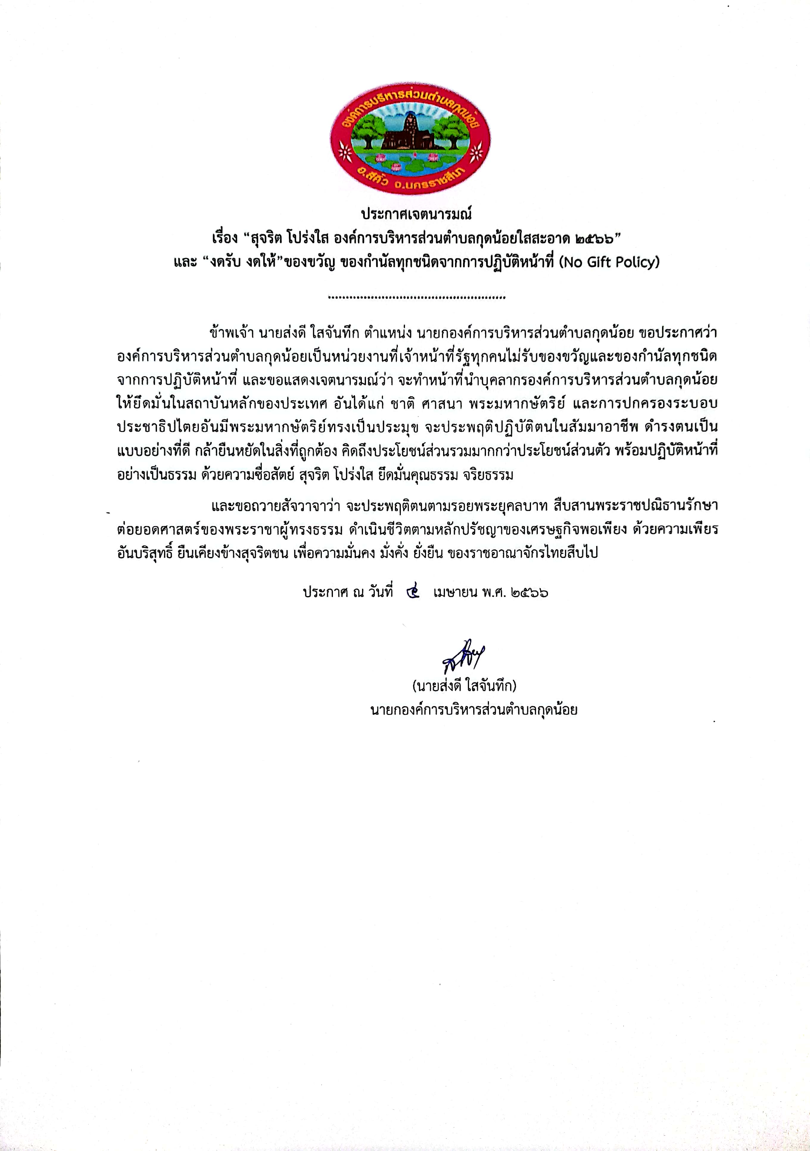 ประกาศเจตนารมณ์นโยบาย No Gift Policy ประจำปีงบประมาณ พ.ศ. 2566