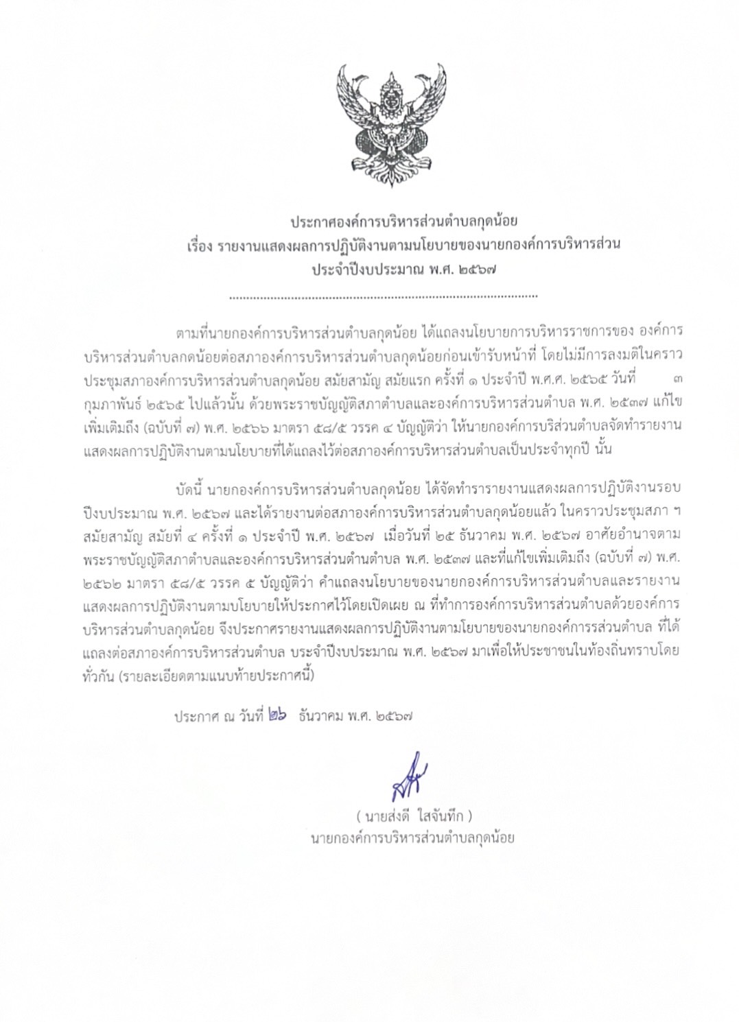 รายงานแสดงผลการปฏิบัติงานตามนโยบาย ของนายกองค์การบริหารส่วนตำบลกุดน้อย ประจำปีงบประมาณ พ.ศ. 2567 ดาวน์โหลด