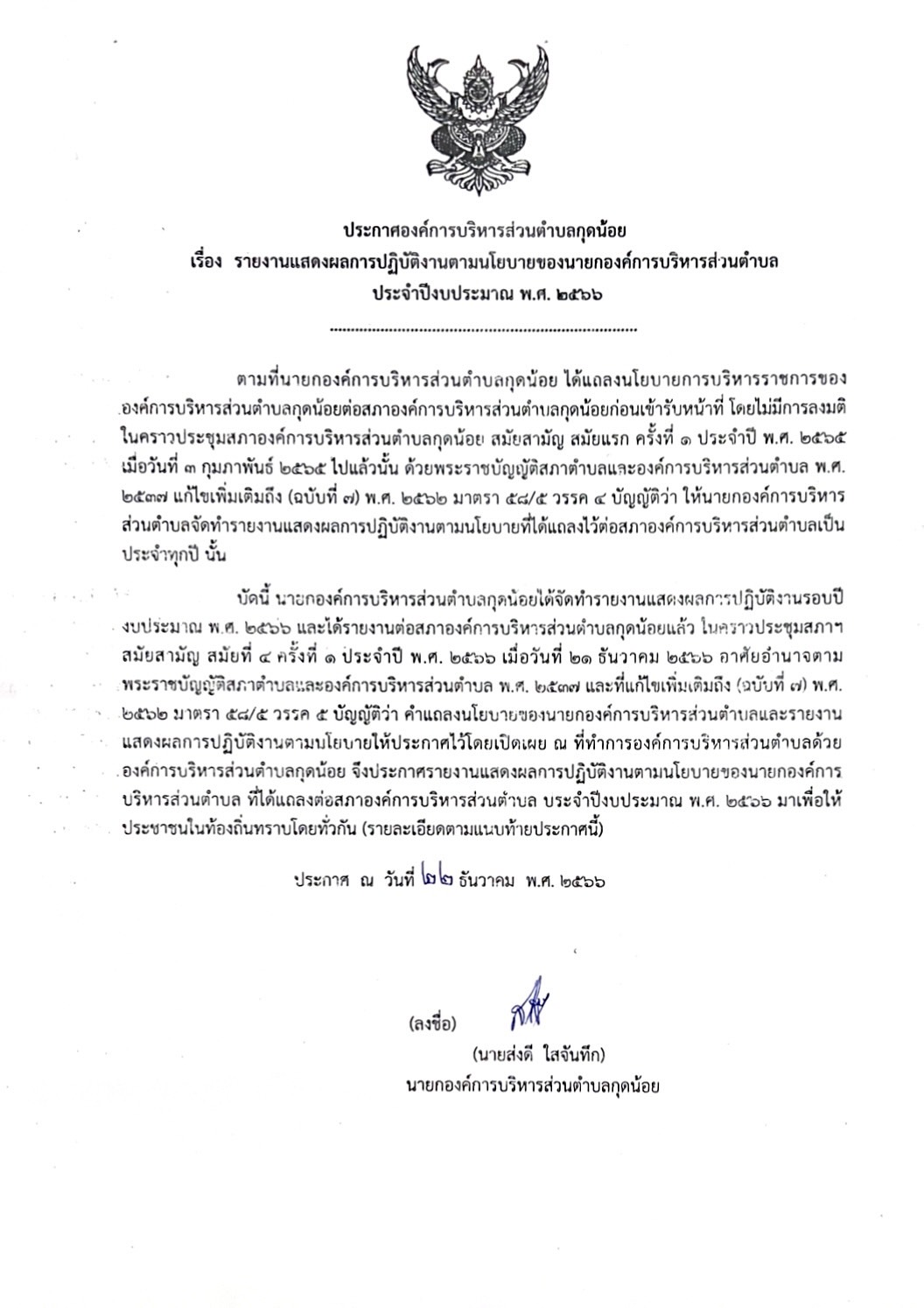 รายงานแสดงผลการปฏิบัติงานตามนโยบาย ของนายกองค์การบริหารส่วนตำบลกุดน้อย ประจำปีงบประมาณ พ.ศ. 2565